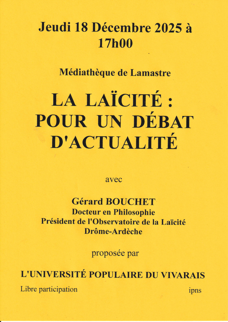 Conférence "LA LAÏCITE POUR UN DEBAT D'ACTUALITE" avec Gérard Bouchet, Dr en philosophie.