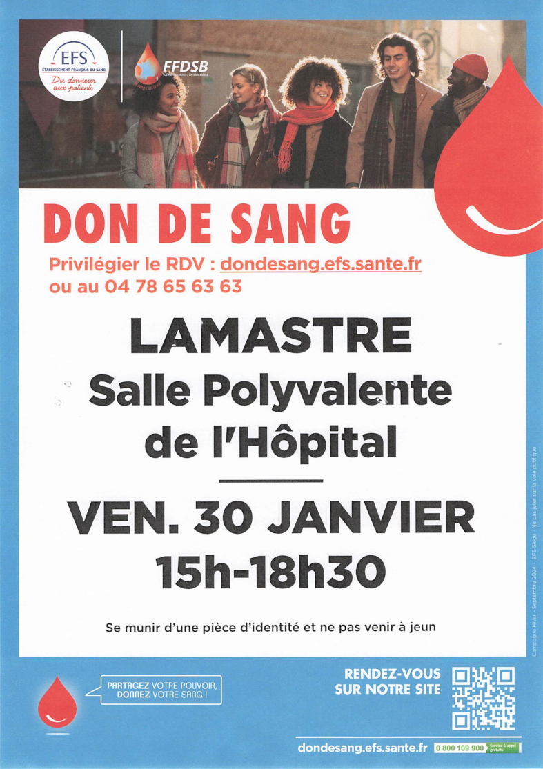 Prendre rendez-vous au 04 75 82 44 05 ou sur dondesang.efs.sante.fr.